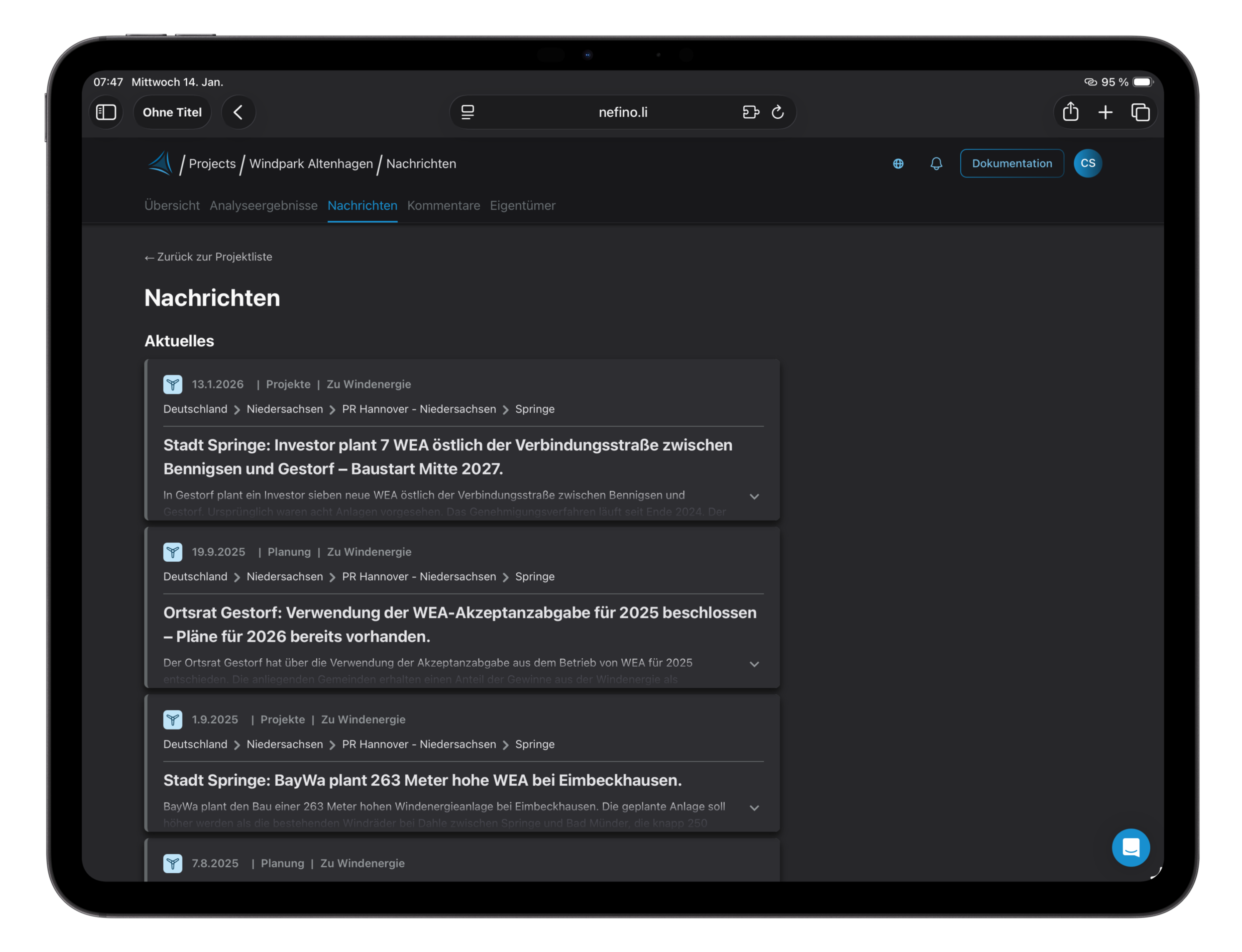 Im Gegensatz zu klassischen Ratsinformationssystemen betrachtet Nefino.LI News Informationen ganzheitlich im Projektkontext und bündelt sie in einem zentralen Informations-Hub für die Energiewende.